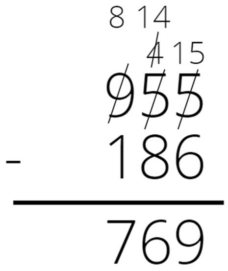 Zapisz liczby jedna pod drugą. Odejmuj kolumnami. Jeśli cyfra górna jest mniejsza od dolnej, to dodaj do niej 10, a cyfrę po lewej stronie zmniejsz o 1 i wykonaj odejmowanie na nowo powstałych liczbach. Jeśli nowo napisana liczba jest mniejsza od dolnej cyfry, to powiększ ją o 10, a następną cyfrę po lewej zmniejsz o 1. Jeśli musimy zmniejszyć o 1 cyfrę 0, to zamień ją na 9 i zmniejsz o 1 następną cyfrę po lewej stronie.