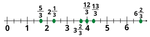 Podziałka na osi to jedna trzecia. Patrz na całości, a liczba w liczniku mówi, ile kroków w prawo od całości mamy zrobić. Musisz w przypadku ułamka niewłaściwego liczyć liczbę kroków (liczba w mianowniku) od liczby 0.
