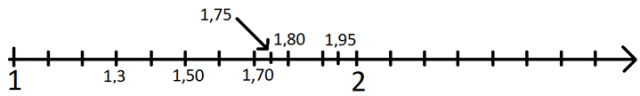 Każda kolejna kreseczka oznacza liczbę większą od poprzedniej o 0,1. Dlatego liczbę 1,3 musisz zapisać na trzeciej kreseczce, liczbę 1,50 musisz zapisać na piątej kreseczce, liczbę 1,70 musisz zapisać na siódmej kreseczce, liczbę 1,75 musisz zapisać pomiędzy siódmą a ósmą kreseczką, 1,80 musisz zapisać na ósmej kreseczce, a liczbę 1,95 musisz zapisać pomiędzy dziewiątą a dziesiątą kreseczką.