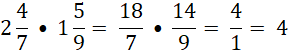 Liczby mieszane musisz zamienić na ułamki niewłaściwe. W pierwszym przykładzie musisz skrócić 4 i 4 przez 4 oraz 3 i 9 przez 3. W drugim przykładzie – skrócić 8 i 2 przez 2. W trzecim przykładzie musisz skrócić 14 i 7 przez 7 oraz 18 i 9 przez 9.