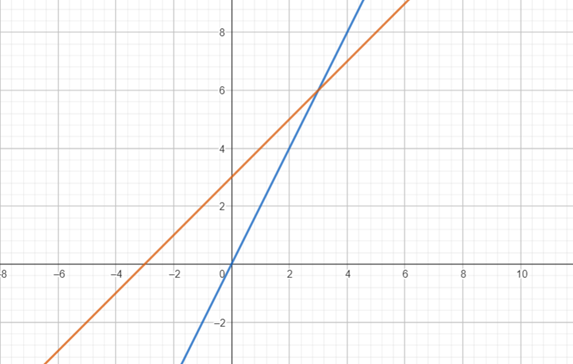 Narysuj dwie osobne funkcje, f(x) = x + 3oraz g(x) = 2x i odczytaj punkty przecięcia funkcji.
