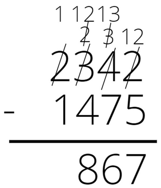 Zapisz liczby jedna pod drugą. Odejmuj kolumnami. Jeśli cyfra górna jest mniejsza od dolnej, to dodaj do niej 10, a cyfrę po lewej stronie zmniejsz o 1 i wykonaj odejmowanie na nowo powstałych liczbach. Jeśli nowo napisana liczba jest mniejsza od dolnej cyfry, to powiększ ją o 10, a następną cyfrę po lewej zmniejsz o 1. Jeśli musimy zmniejszyć o 1 cyfrę 0, to zamień ją na 9 i zmniejsz o 1 następną cyfrę po lewej stronie.