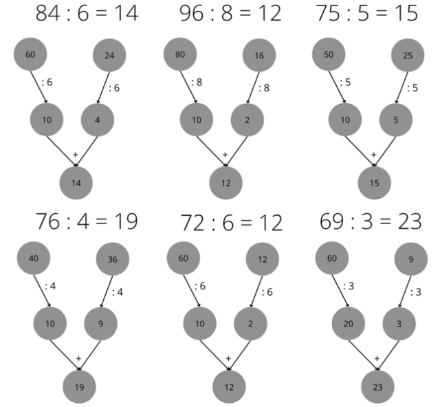 84 : 6 = (60 + 24) : 6 = 60 : 6 + 24 : 6 = 10 + 4 = 14