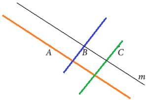 Narysuj kilka prostych: równoległą do prostej m, która przechodzi przez punkt A, prostopadłą do tej samej prostej, która przechodzi przez punkt B oraz prostopadłą do tej samej prostej, która przechodzi przez punkt C.