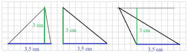 Aby pola były takie same, musisz trójkąty narysować tak, aby jeden z boków oraz wysokość do niego prostopadła miały długości jak długości w narysowanym już trójkącie.
