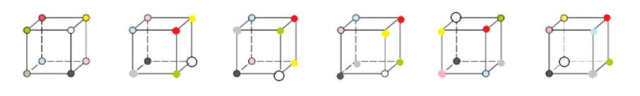 W tym zadaniu albo musisz sobie wyobrazić odwracanie sześcianu lub na modelu (np. kostki sześciennej) zakolorować odpowiednie wierzchołki i obracać tak, aby zadane kolory się zgadzały z ułożeniem. Wtedy możesz uzupełnić pozostałe kolory, patrząc na ustawiony model.