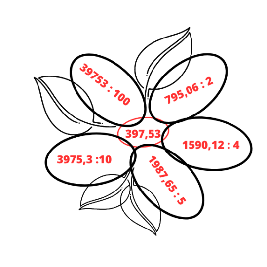 Wybierz liczbę naturalną i pomnóż ją przez liczbę ze środka kwiatka. Mnożenie jest odwrotnością dzielenia, więc jeśli otrzymaną liczbę podzielimy przez liczbę naturalną, przez którą wcześniej mnożyliśmy, to otrzymamy wynik ze środka.
