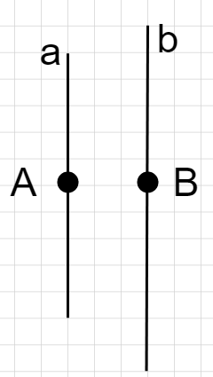 Rysunek, który przedstawia dwa punkty i przechodzące przez zeń proste równoległe wobec siebie.