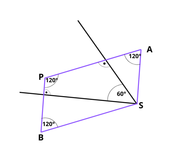 Zauważ, że APBS to równoległobok, a z jego własności wiemy, że kąty leżące naprzeciw siebie mają taką samą miarę. W związku z tym, skoro kąt APB ma miarę 120°, kąt ASB również ma miarę 120°.
