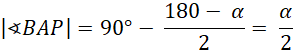 Oznacz kąt środkowy jako α. Kąt wpisany w okrąg przy wierzchołku C oparty na tym samym łuku co kąt środkowy ma wartość