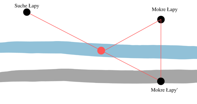 Wykorzystaj taki sam schemat jak w przypadku podpunktu a). Zaznacz punkt symetryczny do jednej z miejscowości (Mokre Łapy’) i wtedy odległość pomiędzy tymi dwoma punktami będzie odległością najkrótszą, jaką drogi mogą osiągnąć.