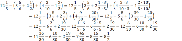 Aby rozwiązać to zadanie, przypomnij sobie, jaka jest kolejność wykonywania działań. Najpierw wykonujemy działania w nawiasach, potem mnożenie i dzielenie, a następnie dodawanie i odejmowanie. Dodając i odejmując ułamki zwykłe, pamiętaj, że musisz sprowadzić je do wspólnego mianownika. W tym działaniu wspólnym mianownikiem liczb 6 i 2 jest liczba 6, liczb 10 i 3 jest liczba 30, liczb 5, 6 i 30 jest liczba 30. Jeżeli to potrzebne, z odjemnej wyłoń całość.