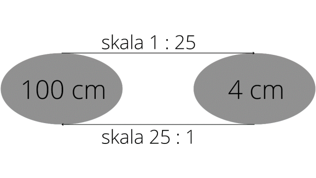 Podane liczby pomnóż, jeśli skala wynosi x : 1 oraz podziel, jeśli skala wynosi 1 : x, przez daną skalę.