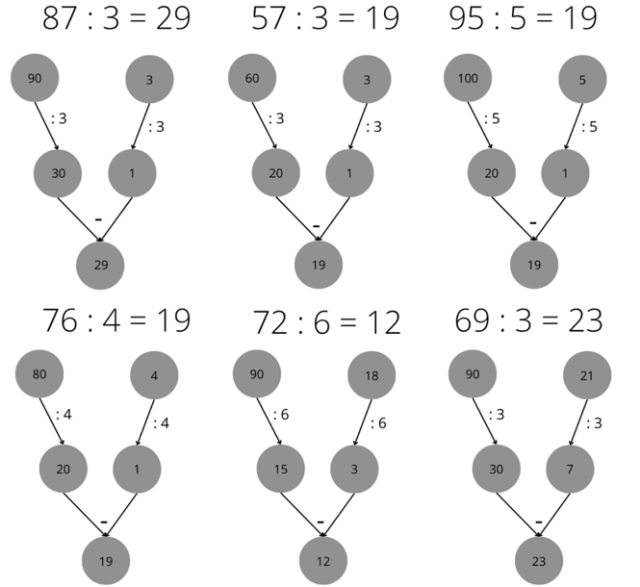 Do każdej podanej liczby, dodaj liczbę, dzięki której łatwiej będzie podzielić, a na końcu odejmij dwa otrzymane wyniki, a powstanie wynik właściwy.