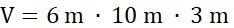Wymiary sali to na przykład 6 m × 10 m × 3 m.