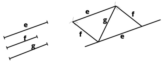 Narysuj prostą i odmierz na nim odcinek e. Następnie odmierz odcinek g, wbij nóżkę cyrkla w pierwszy koniec odcinka e i narysuj łuk. Odmierz odcinek f, wbij nóżkę cyrkla w drugi koniec odcinka i narysuj łuk. Punkt przecięcia łuków wskaże trzeci punkt równoległoboku. Następnie odmierz odcinek e, wbij nóżkę cyrkla w nowo narysowany punkt i zaznacz łuk. Odmierz odcinek f, wbij nóżkę cyrkla w pierwszy koniec punktu e i narysuj łuk. Punkt przecięcia łuków pokaże, gdzie jest czwarty punkt równoległoboku.