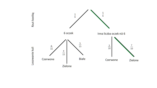 W tym zadaniu musisz wyliczyć prawdopodobieństwo, że wylosujesz kulę zieloną z drugiego pudełka, jeśli doświadczenie losowe polega na rzucie kostką, a następnie, jeśli wypadnie 6 oczek to losowaniu kuli z pierwszego pudełka, w którym jest 15 kul – 6 czerwonych, 4 zielone oraz 5 białych, natomiast w przeciwnym wypadku losuje się kule z drugiego pudełka, w którym jest 10 kul – 3 czerwone oraz 7 zielonych.