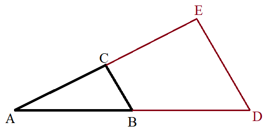 Trójkąt ABC jest trójkątem oryginalnym. Odłóż na przedłużeniu odcinka AB długość równą temu odcinkowi wbijając nóżkę cyrkla w punkt B, odmierzając długość do punktu A oraz zaznaczając ją na przedłużeniu do punktu D. Odcinek AD to dwukrotność odcinka AB. Tak samo postąp z odcinkiem AC przedłużając go dwukrotnie do odcinka AE. Na końcu połącz punkty D i E. Trójkąt ADE ma wszystkie boki 2 razy dłuższe od boków trójkąta ABC.