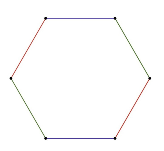 Sześciokąt foremny ma trzy pary boków równoległych – zostały oznaczone różnymi kolorami.