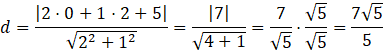 W tym zadaniu trzeba obliczyć w jakiej odległości punkt P o współrzędnych (0, 2) znajduje się od prostej o równaniu 2x + y + 5 = 0 korzystając ze wzoru na odległość punktu d od prostej o równaniu w postaci ogólnej.