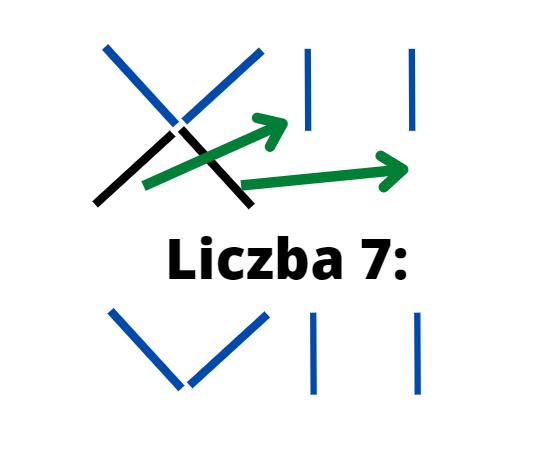 Ułóż z patyczków liczbę X i przełóż 2 patyczki, by otrzymać VII.