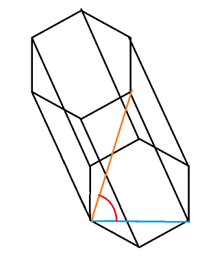 Niebieskim kolorem zaznaczono przekątną podstawy, pomarańczowym kolorem zaznaczono krótszą przekątną graniastosłupa. Kąt, jaki utworzyły proste, jest szukanym kątem.