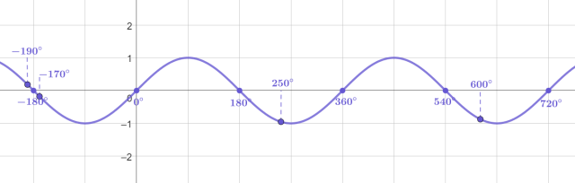 Dane są wyrażenia: sin(-170°), sin(-190°), sin 600°, sin 250°. Bazując na wykresie funkcji y = sin α ustal, które z nich ma wartość większą od zera.