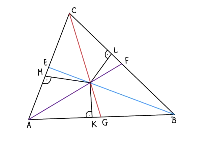 Przypomnij informację o dwusiecznej kąta. Jest ona zbiorem punktów równoodległych od ramion tego kąta. Zatem |MD|=|KD| oraz |KD|=|LD|. Wynika z tego, że |MD|=|LD| czyli punkt D jest jednakowo odległy od ramion kąta ACB. Wynika z tego że półprosta CD jest dwusieczną kąta ACB, czyli dwusieczne kątów trójkąta przecinają się w jednym punkcie.