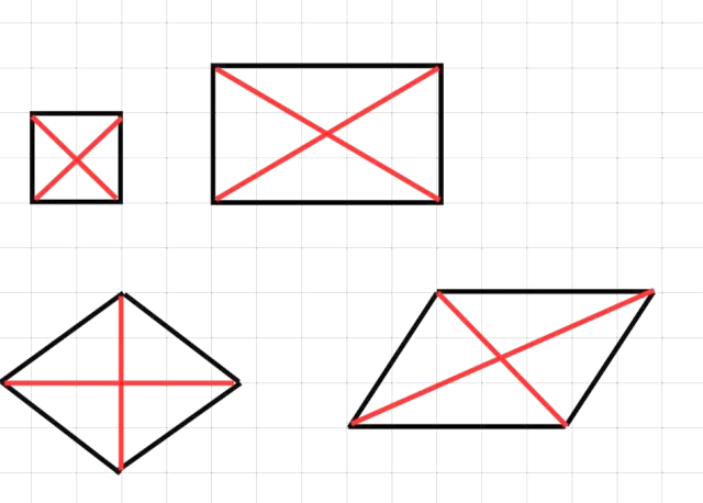 Przekątne narysowanych figur przecinają się w połowie, a dodatkowo przekątne kwadratu i rombu przecinają się pod kątem prostym.