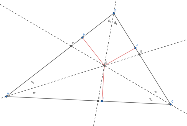 |IG| = |GJ|, |GJ| = |GH| oraz |GH| = |GI|, zatem dwusieczne kąta dowolnego trójkąta zawsze przecinają się w jednym punkcie.