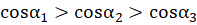 Boki naprzeciwko kątów alfa oznaczamy kolejno od lewej a1, a2, a3. Boki przy kątach alfa oznaczamy kolejno od lewej b1, b2, b3. Przeciwprostokątne są równe 1. Układasz stosunki boków oznaczających funkcje cosinusa i określasz największego cosinusa.