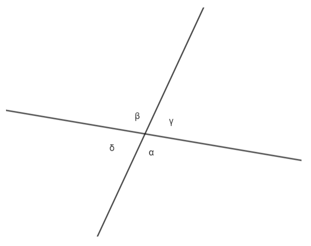 Kąty wierzchołkowe: α i β, γ i δ.