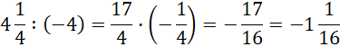 to ponad 4, a 4 : (-4) to -1, mu potrzebujemy ułamka bez całości. W ostatnim wyrażeniu po zamianie np. liczby dziesiętnej na mieszaną otrzymamy wynik ujemny (większą wartość bezwzględną ma liczba z minusem), a wartość bezwzględną wyniku wyliczymy, odejmując od większej wartości bezwzględnej, wartość mniejszą.
