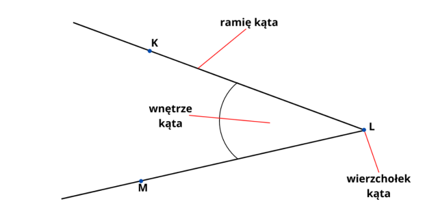Wierzchołek kąta to punkt łączący dwie półproste tworzące kąt, ramie to jedna z półprostych tworząca kąt, a wnętrze kąta to przestrzeń wycięta przez dwie półproste. Podpisz je na rysunku.