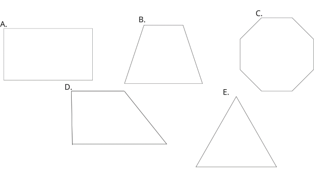 Przeanalizuj podane figury i połącz je z poprawnym opisem. Pamiętaj, że katy ostre są mniejsze niż 90°, rozwarte większe niż 90°, a prosty jest równy 90°. Sprawdź, które z figur A-E, spełniają warunki I-V.