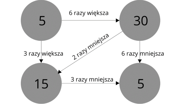 Napisz przy strzałach, ile razy większe lub mniejsze są dane liczby.