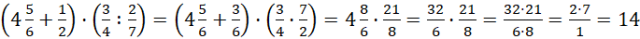 Pamiętaj o kolejności wykonywania działań: pierwszeństwo mają działania w nawiasach, po nich wykonaj mnożenie otrzymanych wyników. Aby dodać do siebie liczbę mieszaną i ułamek w pierwszym nawiasie, sprowadź je do wspólnego mianownika i dodaj do siebie liczniki. Dzielenie zastąp mnożeniem przez odwrotność drugiego ułamka. Zapisz wynik dodawania w postaci ułamka niewłaściwego i mnóż go przez wynik mnożenia z drugiego nawiasu, skracaj licznik jednego ułamka z mianownikiem drugiego i odwrotnie.