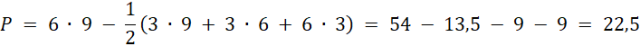 Narysujmy prostokąt, który przechodzi przez wierzchołki trójkąta i zawiera go całego w środku. Pole trójkąta to różnica sumy pola tego prostokąta i sumy pól trójkątów prostokątnych, które również się w nim zawierają. Zapisując to w wyrażeniu algebraicznym mamy: