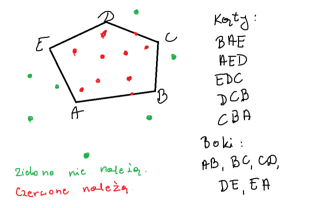 Narysuj dowolny pięciokąt, używając linijki. Następnie podpisz jego wierzchołki po kolei, używając liter na przykład A, B, C, D, E (użyj pięciu kolejnych liter). Następnie wypisz boki: AB, BC, CD, DE, EA. Teraz kąty: EAB, ABC, BCD, CDE, DEA. Teraz zaznacz kilka punktów wewnątrz pięciokąta lub na jego bokach – te punkty do niego należą. Następnie zaznacz kilka punktów na zewnątrz pięciokąta – te punkty do niego nie należą.