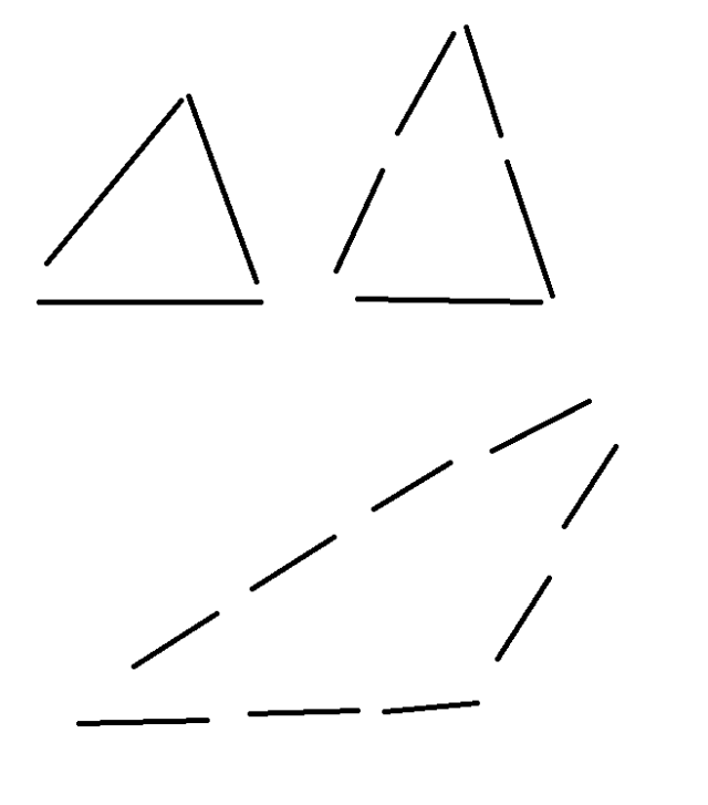 Ułóż trójkąt z trzech patyczków i zauważ, że powstał trójkąt równoboczny. Następnie ułóż trójkąt z 5 patyczków. Jednego patyczka użyj na podstawę a po 2 na każde z ramion. Powstanie wtedy trójkąt równoramienny. Teraz ułóż trójkąt z 9 patyczków, pamiętając, że boki mają mieć różną długość. Użyj na budowę jednego boku 2 patyczki, na budowę drugiego 3, a na trzeci bok 4 patyczki.