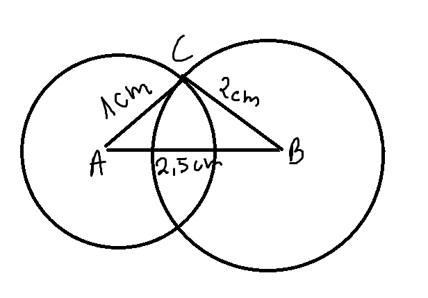 Zauważ, że punkt C leży na okręgu o środku A, czyli odległość między punktami A i C to długość promienia, czyli 1 cm. Zauważ też, że punkt C leży na okręgu o środku B, czyli odległość między punktami B i C to długość promienia, czyli 2 cm.