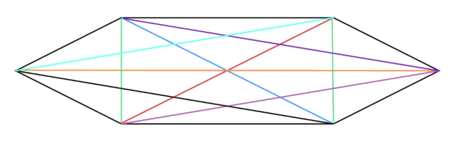 W tym zadaniu musisz narysować dowolny sześciokąt, poprowadź trzy przekątne z każdego wierzchołka. Oblicz ile razy narysowana była każda z przekątnych i policz ich ilość