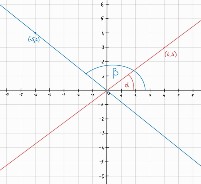 W tym zadaniu musisz narysować dane w treści proste, zaznaczyć ich kąty nachylenia do osi x i obliczyć tangensy tych kątów.