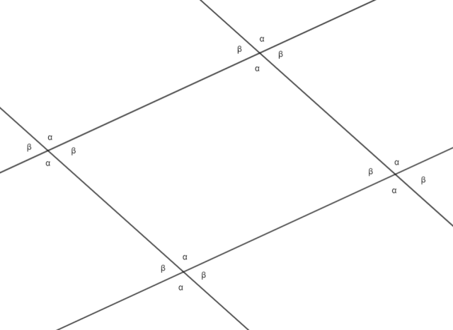 Kąty α i β leżą wzdłuż jednego boku równoległoboku. Są to także kąty przyległe, dlatego ich suma zawsze daje 180˚.