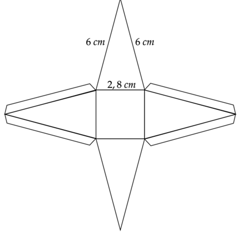 Aby narysować tę siatkę w podanej skali, musisz zmierzyć odcinki zielonej siatki ostrosłupa i każdy z nich pomnożyć przez 4. Następnie dorysuj skrzydełka pozwalające na sklejenie modelu, wytnij go i złóż.