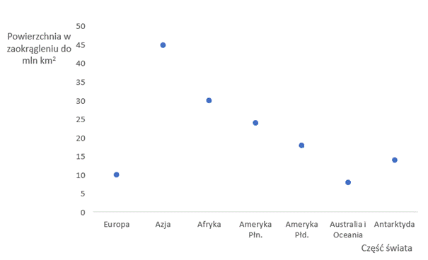 Skorzystaj z informacji zawartych w tabeli w celu narysowania wykresu, a następnie odczytaj powierzchnię Ameryki Północnej oraz Australii i Oceanii i podziel te liczby.