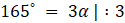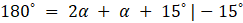 Suma miar kątów w trójkącie jest równa 180˚, kąty przy podstawie są sobie równe, a w danym trójkącie kąt wierzchołkowy jest o 15˚ większy od miary jednego kąta przy podstawie, ułóż równanie opisujące miarę kątów tego trójkąta i oblicz α: