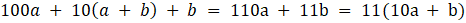 Udowodnij podana tezę: jeśli liczbie trzycyfrowej cyfra dziesiątek jest równa sumie cyfr jedności i setek, to liczba ta jest podzielna przez 11.
