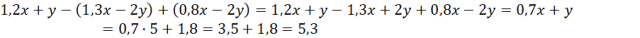 Wykonaj operacje mnożenia i dzielenia na podanych nawiasach. Pamiętaj, że zarówno dzielenie, jak i mnożenie nawiasu przez liczbę, to dzielenie lub mnożenie każdego elementu tego nawiasu przez tę liczbę. Następnie wykonaj operacje dodawania i odejmowania na zapisanych w wyrażeniach wyrazach podobnych. Pamiętaj, że kombinacje liter, ich iloczynów i potęg muszą być takie same, różnić się zaś mogą jedynie czynnikiem liczbowym. Następnie podstaw wypisane wartości niewiadomych.