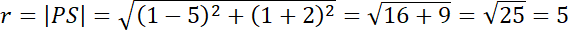 . Oblicz długość |PS| ze wzoru na długość odcinka. Następnie znając współrzędne środka koła i długość promienia, zapisz nierówność opisującą koło.